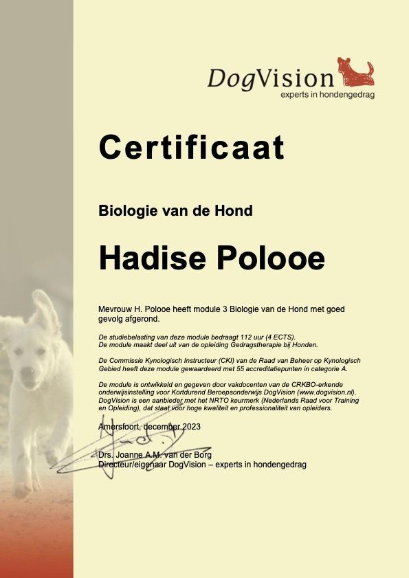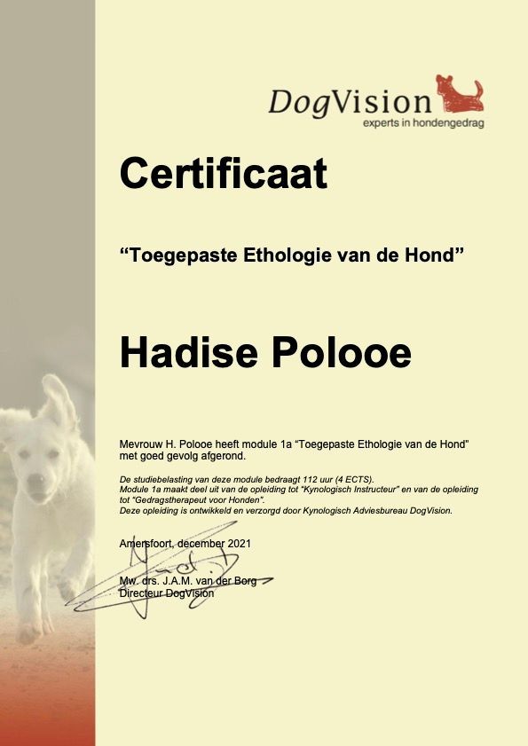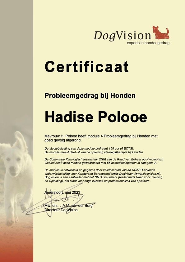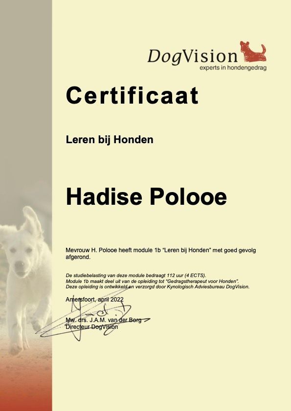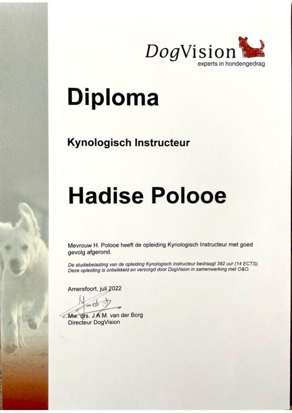 Ik ben Hadise Polooe, een gecertificeerd kynologisch instructeur (ook erkend door de Raad van Beheer) en momenteel bezig met de afronding van mijn opleiding tot gedragstherapeut aan een erkend instituut. Mijn kennis is inmiddels volledig, en na deze fase kan ik samenwerken met huisdierverzekeraars.